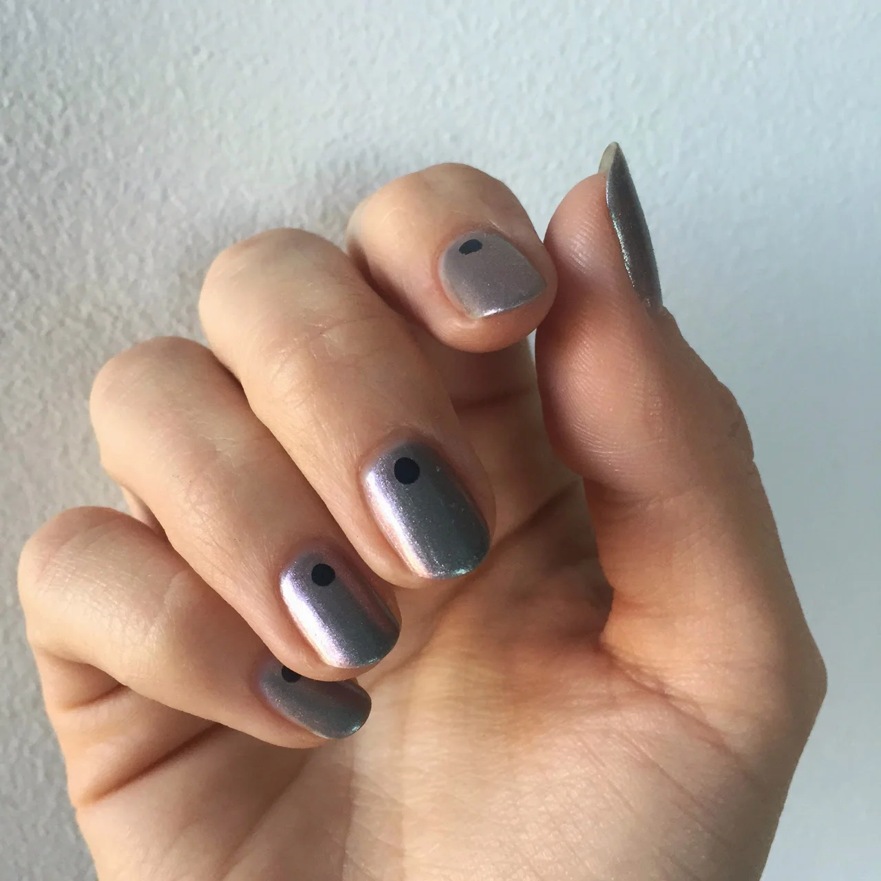 The silvery polish has a tiny microshimmer in it, and flashes green to purple in the light. It's a Revlon polish, and a good one to boot! I'll never argue with a relatively inexpensive polish that does its job well. I like the brush on this polish (it's skinny), and the polish applies smoothly and evenly. I only used two coats on this look, and had to perform minimal cleanup around the cuticles. The dark dots are done with a grey-toned navy from Essie that my sister gifted to me for the holidays. I'd like to use this on my toes sometime soon! My toes are often ignored during the winter as no one sees them. Why waste time polishing them if they're not visible?!