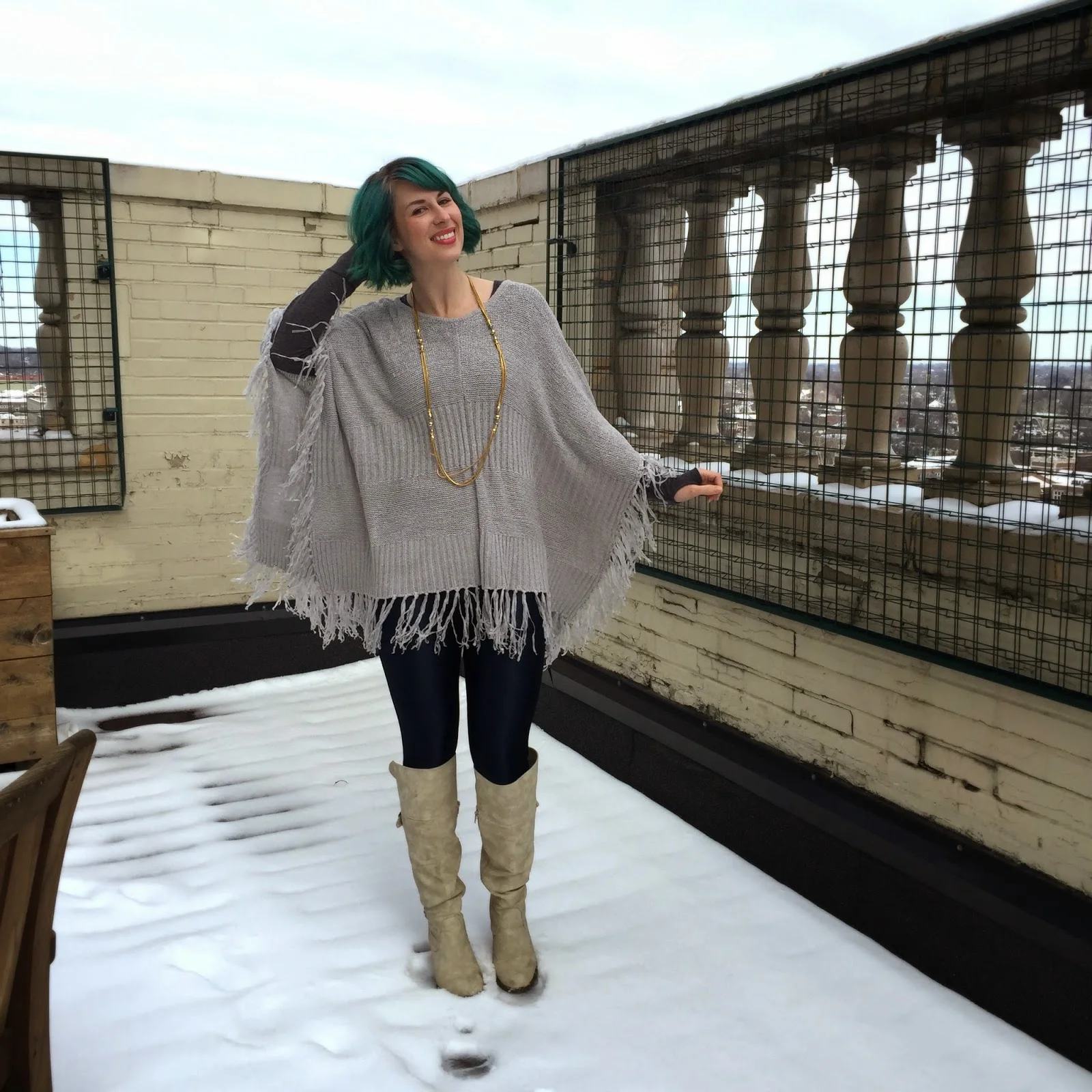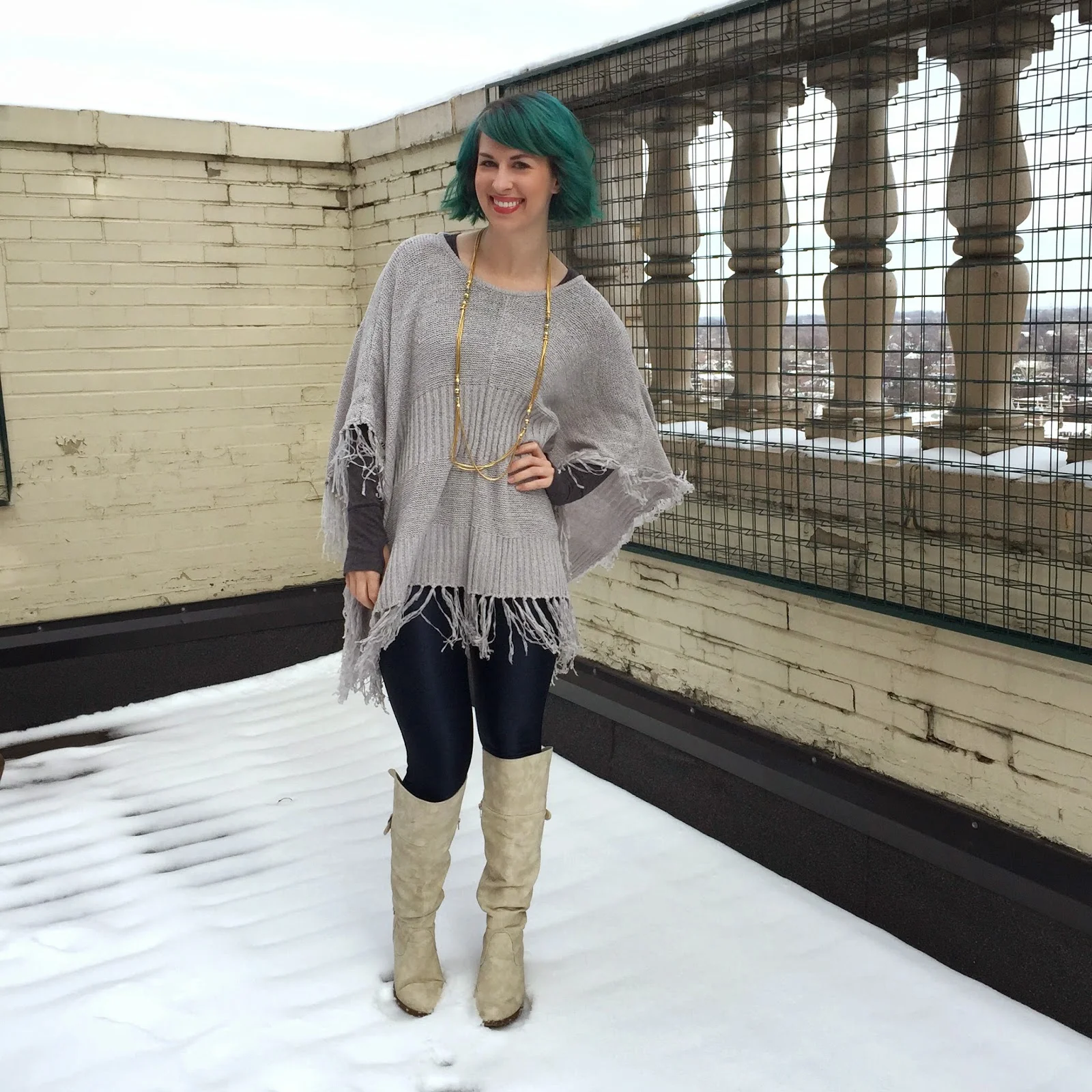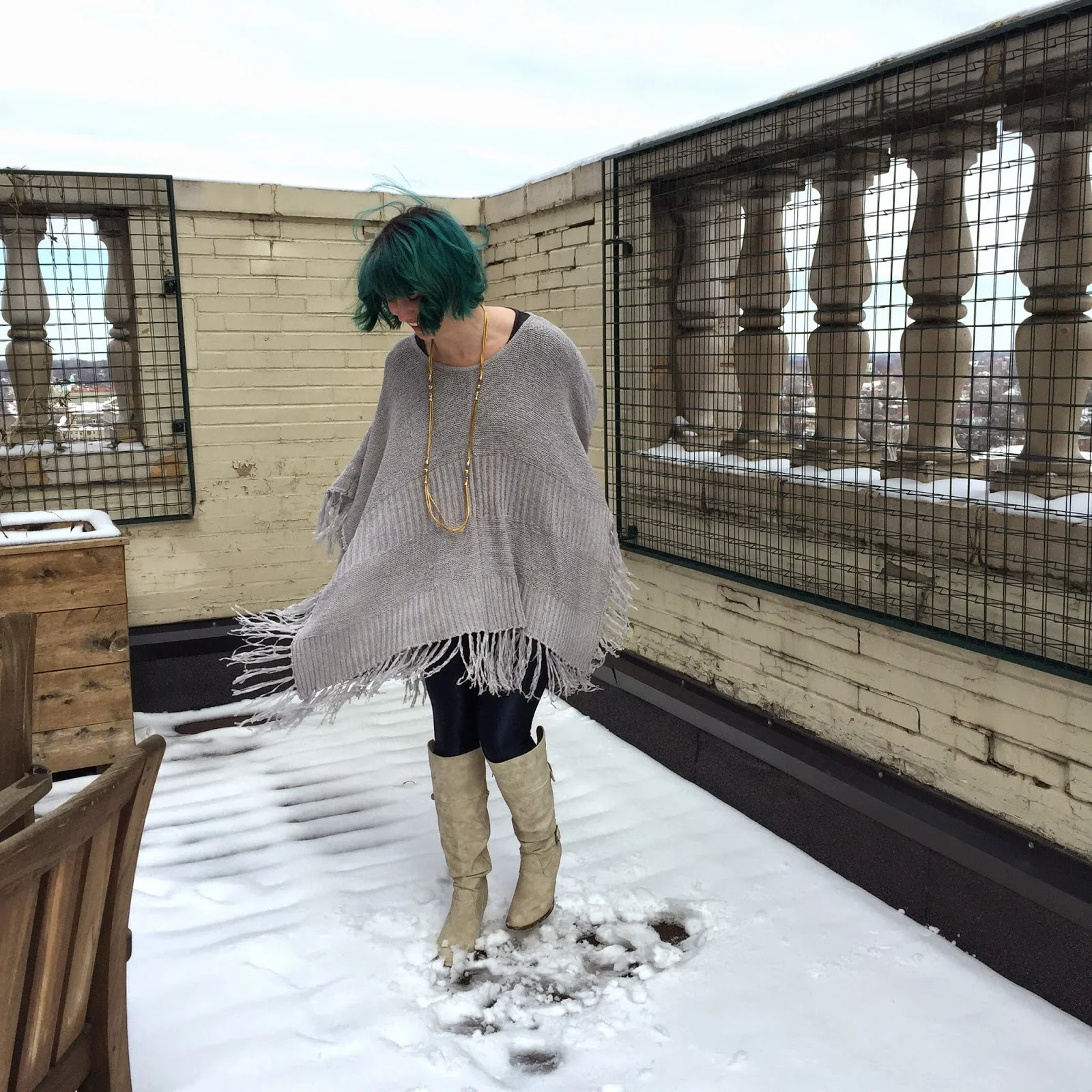 If you live in Saint Louis like I do, you'll know we've had a bit of wintry weather this week! Okay, "a bit" is an understatement. It's been snowy and very cold. I try not to complain until it drops below 25 degrees, and then I start to get cranky. Luckily, I was able to sneak outside during a moment of rare warmer temps this week and snap these photos! This poncho is one of my new favorite items, and I love that it's a versatile piece. I definitely see myself wearing this all year-round, with the right colors and seasonal items. I'm crossing my fingers for spring weather soon so that I can throw this over a tank or bra top, denim cutoffs, and a good pair of fringe-y boots. You can never have enough fringe.