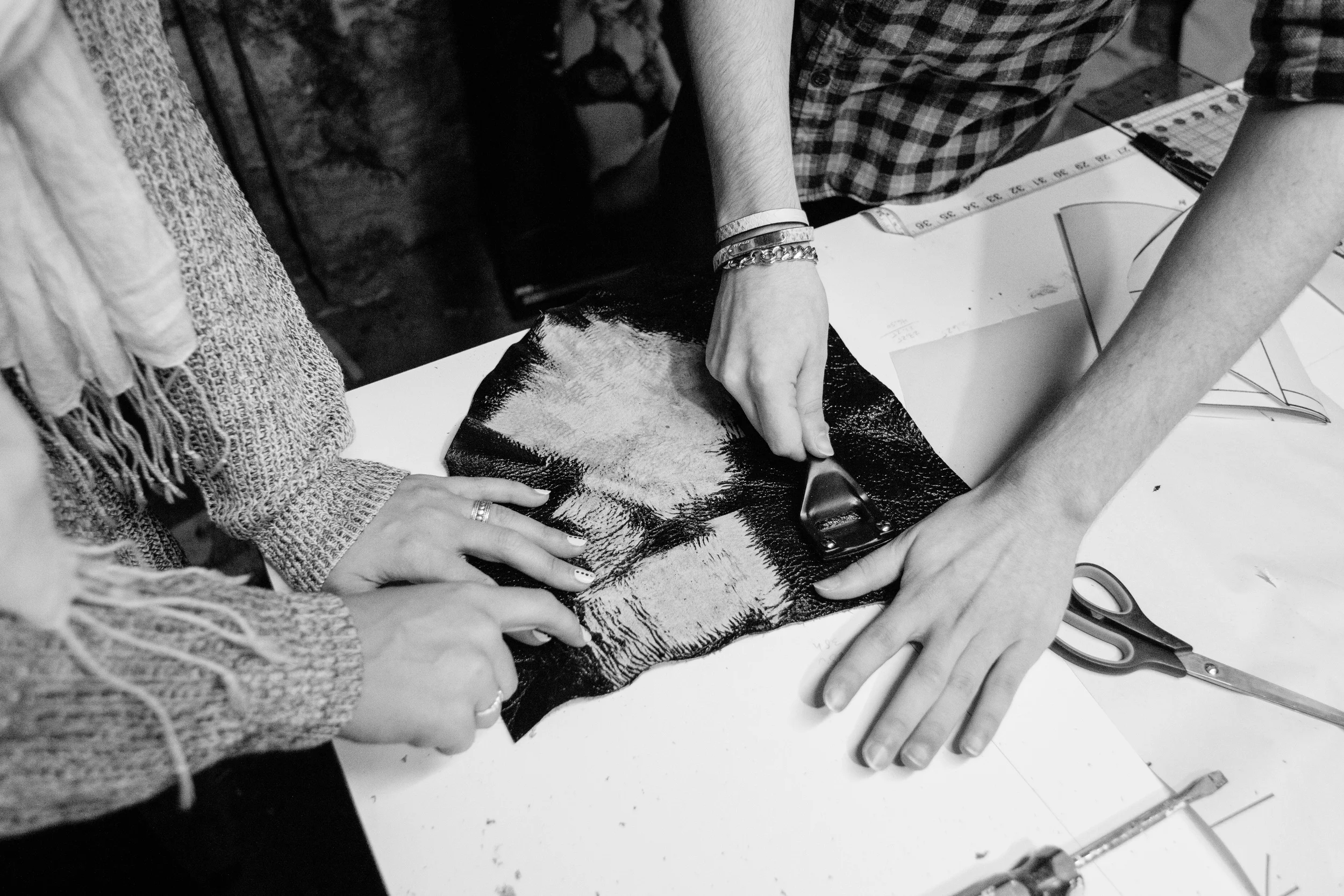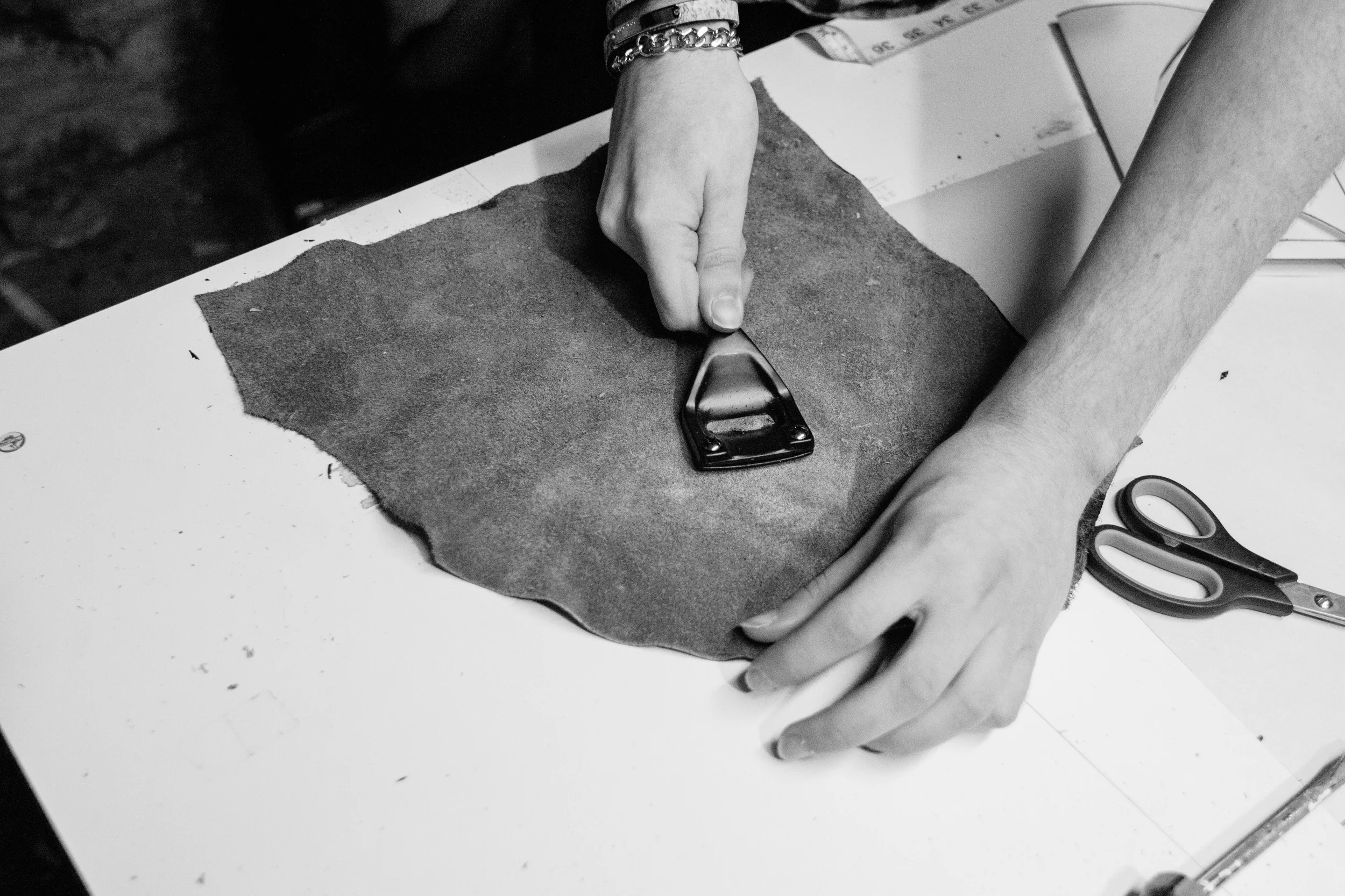 Ryan loves working with leather, and he allowed me to borrow a few of his pieces to take to NYFW with me! See this snapshot here of a handbag he stained and painted, as well as a stunning cuff he crafted. Above, he demonstrated how he softens and thins leather to make it more supple and wearable.