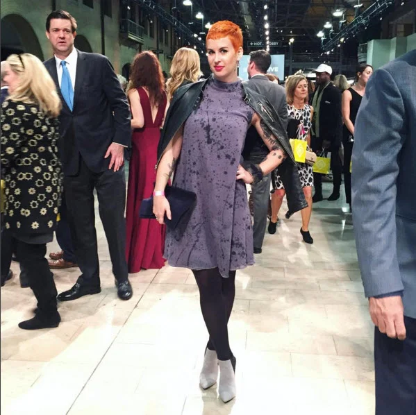 I donned my muslin, or mock-up, and Ryan checked the fit. A few trims here, a couple tweaks there, and voila! We were in business. He made the mock-up of a denim material so that it had weight and would lay more like the final piece, which is made of silk. Instead of a solid color, Ryan and I had agreed on a paint splatter pattern, done by hand, to make the piece truly one of a kind.
