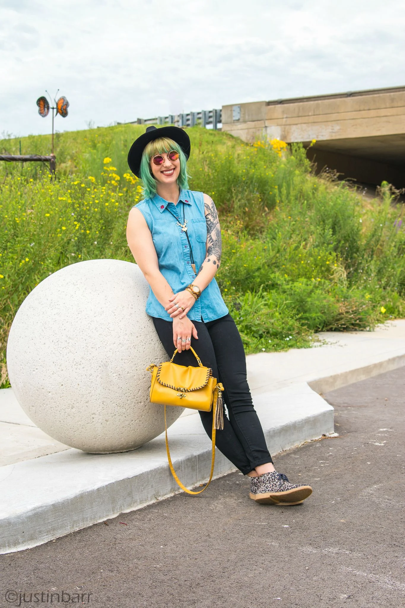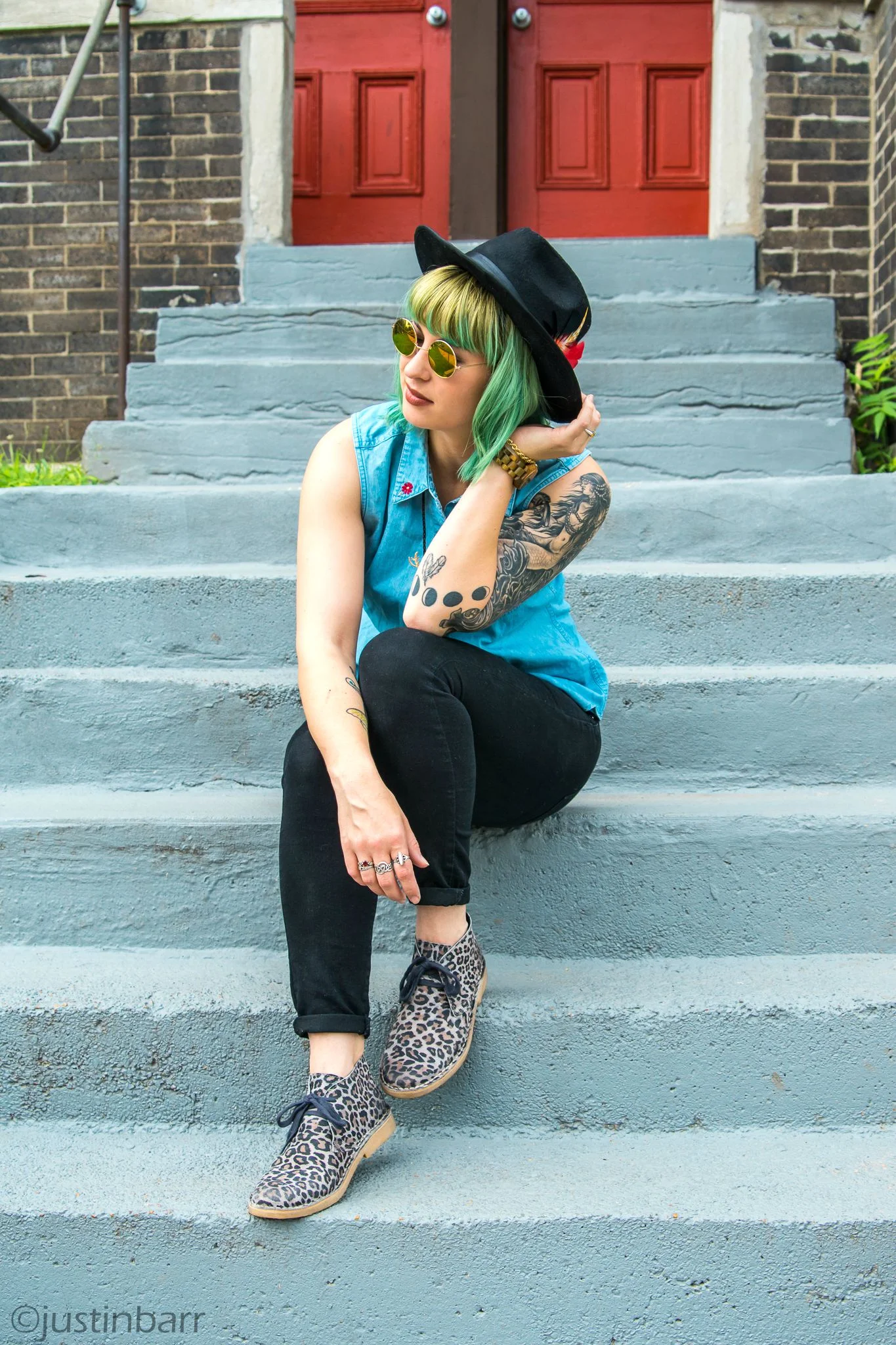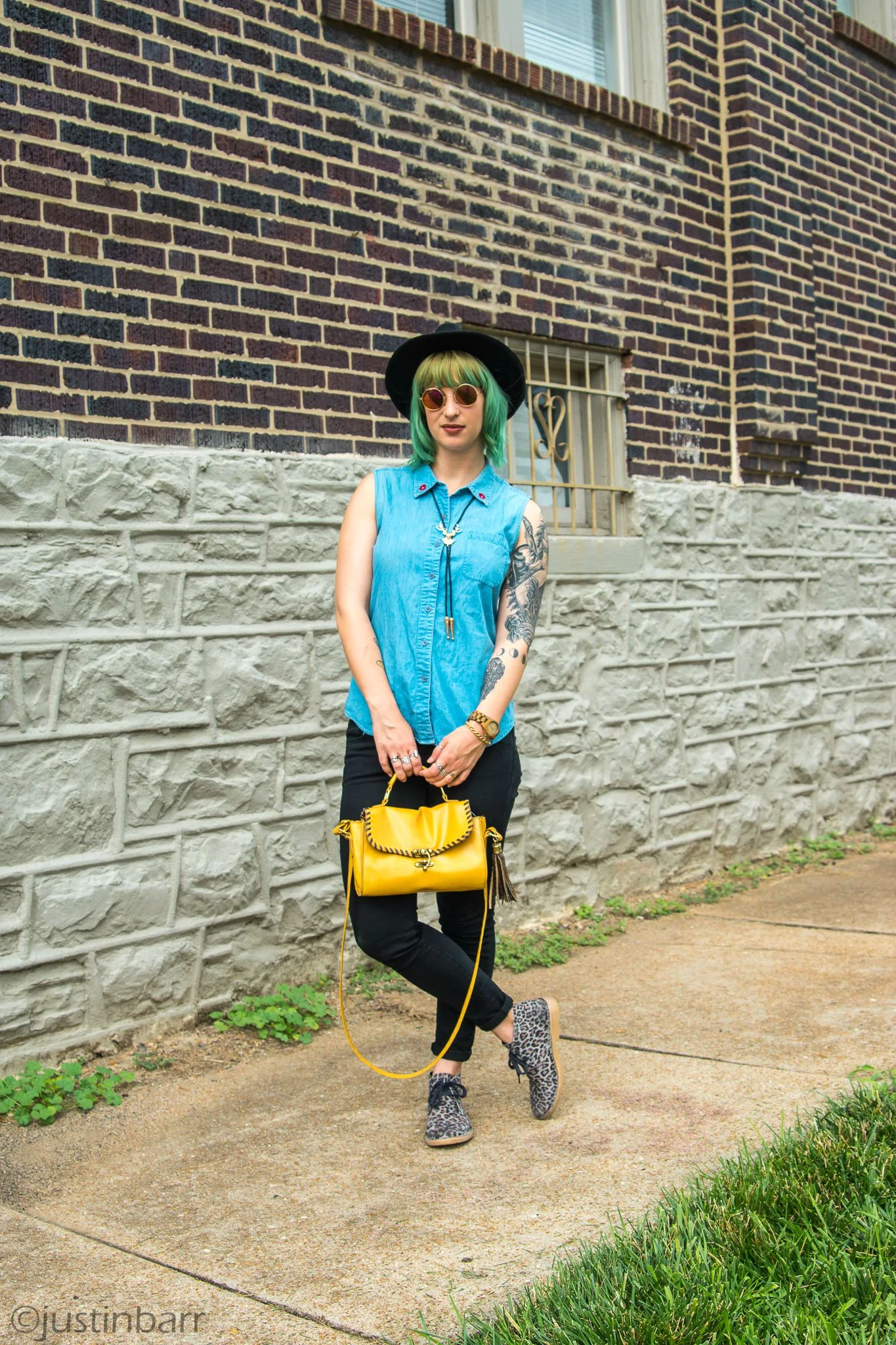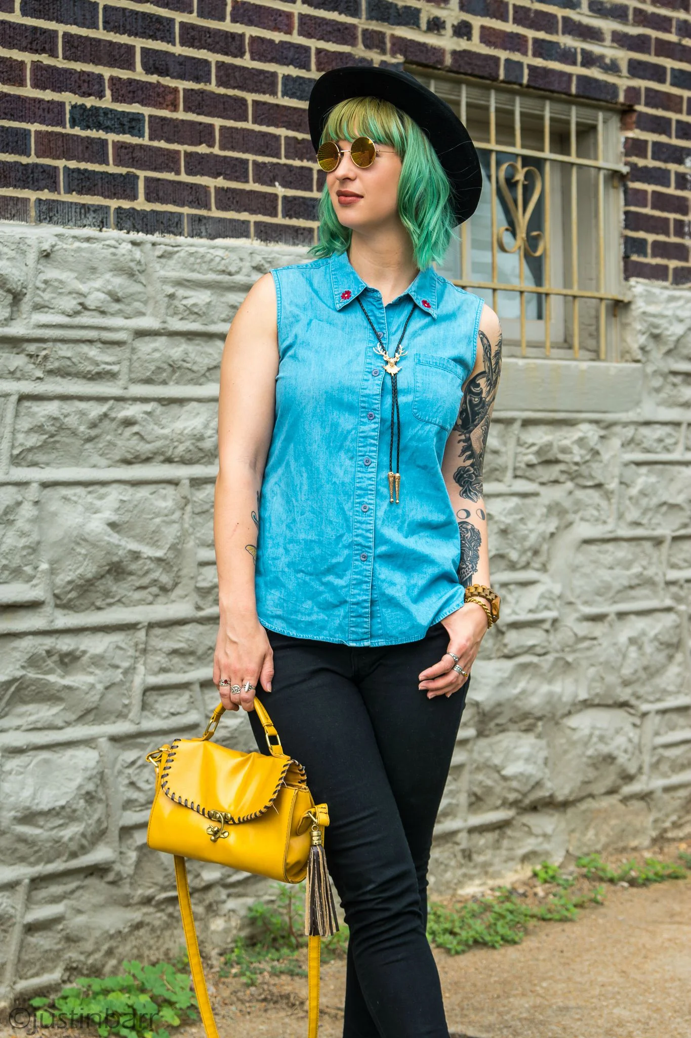 Denim Shirt: Thrifted | Skinny Jeans: Thrifted | Hat & Sunglasses: Avalon Exchange