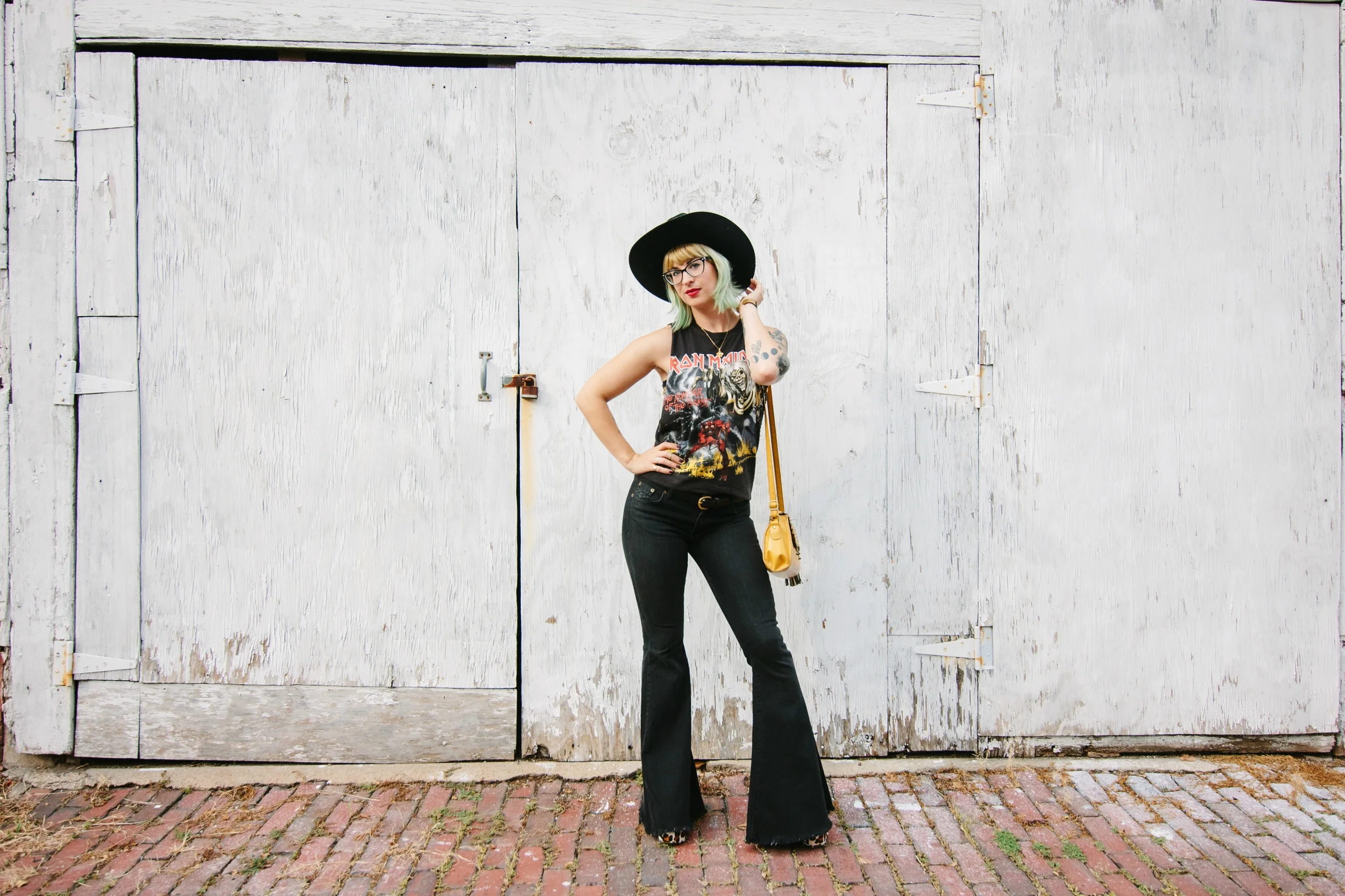 I have a nice little collection of vintage band tees growing inside my closet now. I've been picking them up here and there, and trying to stick with bands that were heavy-hitters in my early taste developmental stages. I know not all of us went through metal stages, but I certainly did. Hence my Iron Maiden (they just released a new album!), Metallica, and Megadeth shirts. I have a pretty kickass Van Halen tee I'm quite fond of as well. However, you frequently find that they've been altered, sometimes even cut into muscle-shirt styles. I personally save the "running around in just a bra under this shirt" look for late nights when I'm not day-walking, so I layered a sequin-covered bandeau top underneath this Iron Maiden baby. I like the unexpected sparkle. These jeans qualify as an impulse buy from a recent trip to the mall. I've been courting the idea of a pair of super-flare jeans, but buying denim can be hard for my athletic legs. For giggles, I tried these Free People jeans on, and angels started singing. Let's not talk about the price tag, however (and they're really not even that expensive, I'm just cheap and unemployed). I want to wear them all the time to make the price worth it! My leopard Jeffrey Campbell Litas are often only worn a few times a month, so this day was the perfect to bust them out on the town. I don't suggest running around brick alleys with them, though!